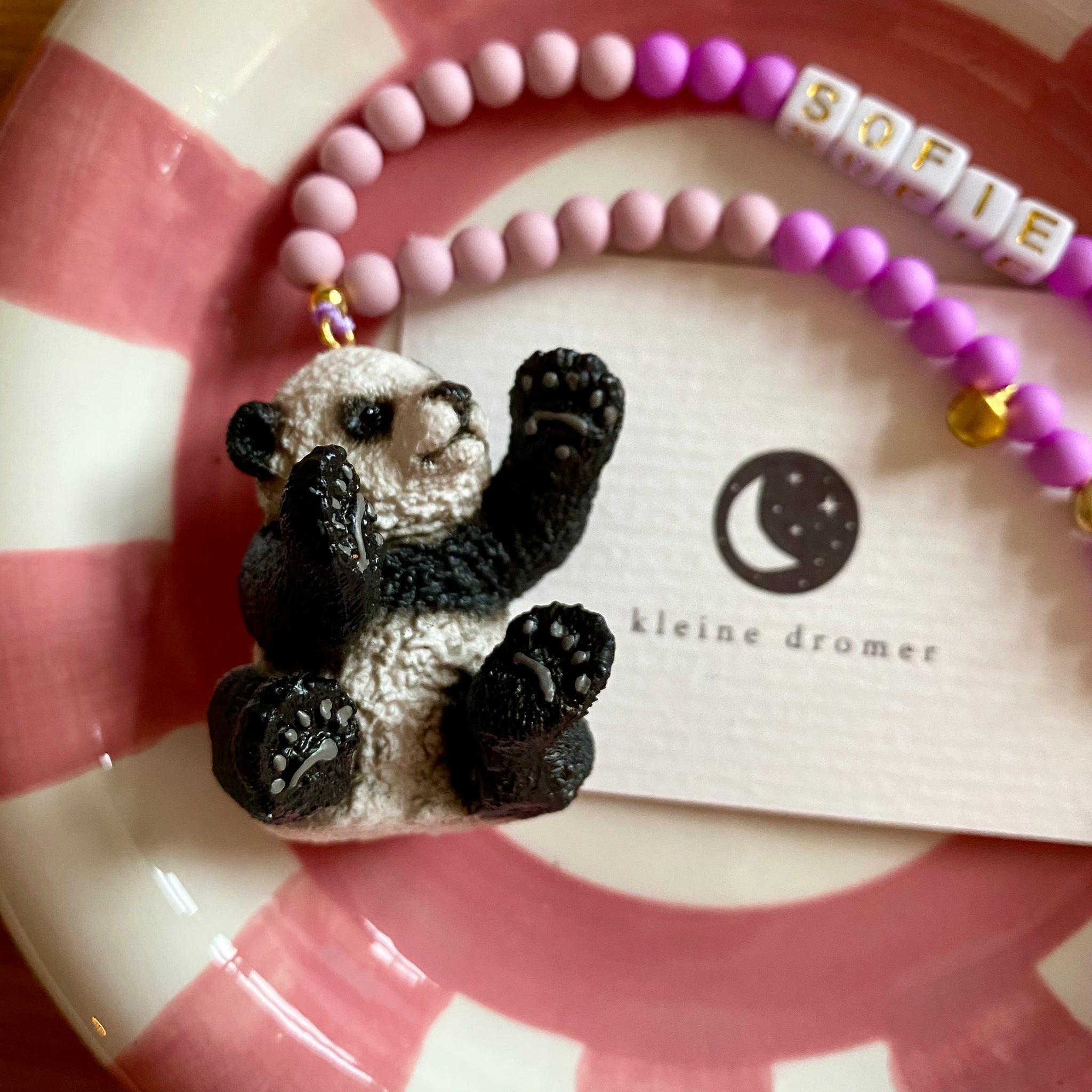 Je kleine dromer maakt de blits met deze vrolijke dierenketting met zijn of haar eigen naam! Deze ketting is gemaakt met de kraalkleuren Vintage Pink & Orchid Purple en draadkleur Purple, een belletje, een hartje en een leuke panda als hanger.