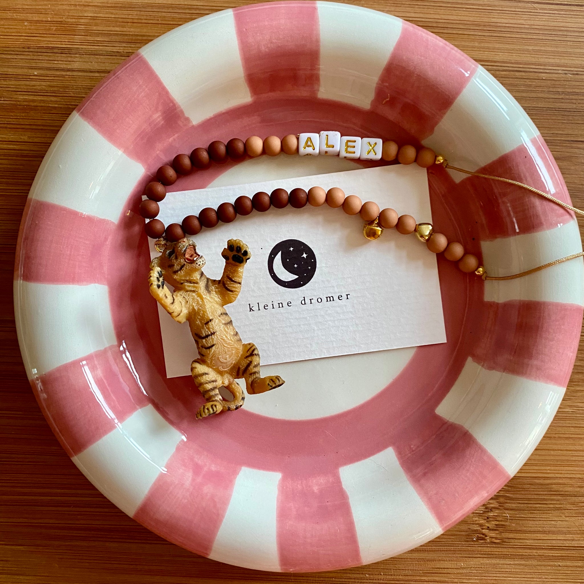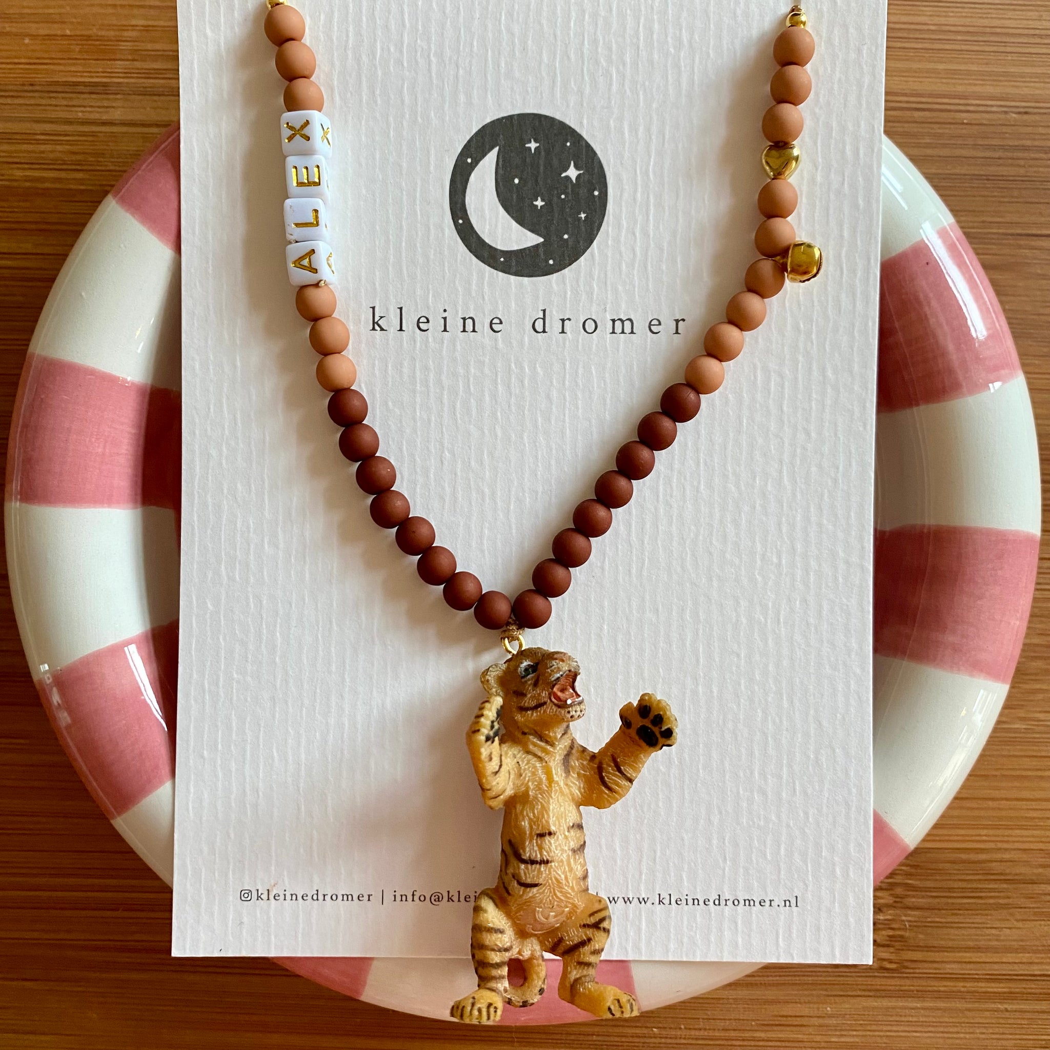 Je kleine dromer maakt de blits met deze vrolijke dierenketting met zijn of haar eigen naam! Deze ketting is gemaakt met de kraalkleuren Dark Brick Brown & Toasted Nut Brown en draadkleur Bronze, een belletje, een hartje en een leuke tijger als hanger.